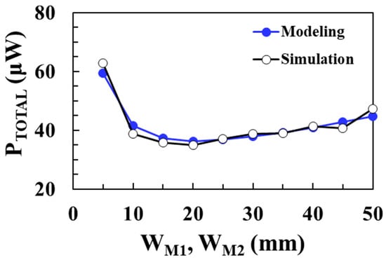 Figure 15 shows the total loss of the DC-DC boost converter according to the width of M1 and M2 switches for an input voltage of 0.1 V and compares the circuit simulation results with the proposed modeling results when VOUT = 1 V, ILOAD = 1 mA, L = 10 μH, and IP = 30 mA. As the NMOS and PMOS switches’ width decreases, the on resistance increases and the conduction losses of the switches increase. On the other hand, as the switches’ width increases, the capacitances increase and the switching losses of the NMOS and PMOS increase. Therefore, there is an optimal switch width that minimizes the total loss. The modeled total loss agrees well with the circuit simulation results and a minimum loss of 36.3 μW is achieved when the switch width is 20 mm. Figure 16 shows the PCE of the boost converter according to the width of M1 and M2 switches for an input voltage of 0.1 V and compares the circuit simulation results with the proposed modeling results. A maximum efficiency of 96.5% is achieved at an optimum switch width of 20 mm and the proposed model accurately predicts the optimal switch width to obtain the maximum PCE.