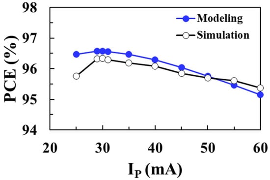 Figure 17 shows the total loss of the DC-DC boost converter according to the peak inductor current IP for an input voltage of 0.1 V and compares the circuit simulation results with the proposed modeling results when VOUT = 1 V, ILOAD = 1 mA, L = 10 μH, and WM1 = WM2 = 20 mm. As the peak inductor current decreases, the switching frequency increases and the switching losses of the NMOS and PMOS increase. On the other hand, as the peak inductor current increases, conduction losses in the switches and inductor increase. Therefore, there is an optimal peak inductor current that minimizes total losses. The modeled total loss agrees well with the circuit simulation results, with a minimum loss of 35.6 μW achieved at an IP of 29 mA. Figure 18 shows the PCE of the boost converter according to the peak inductor current IP for an input voltage of 0.1 V and compares the circuit simulation results with the proposed modeling results. A maximum efficiency of 96.6% is achieved at an optimum IP of 29 mA and the proposed model accurately predicts the optimal IP to obtain the maximum PCE.