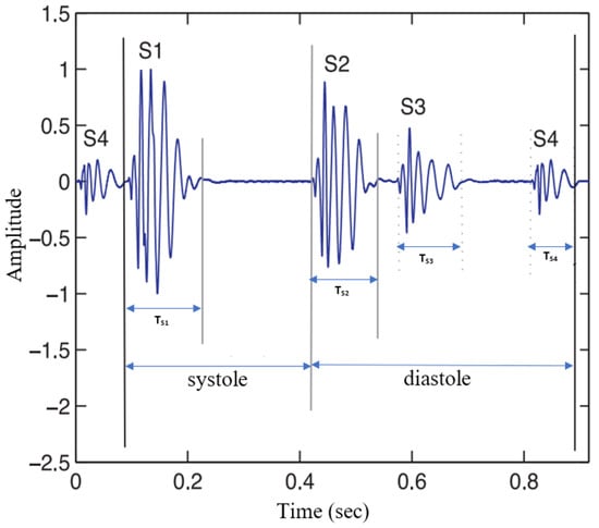 Typical waveform of a phonocardiogram (PCG) signal and its components:  ( = 70–150 ms),  ( = 60–120 ms),  ( = 40–100 ms), and  ( = 40–80 ms).