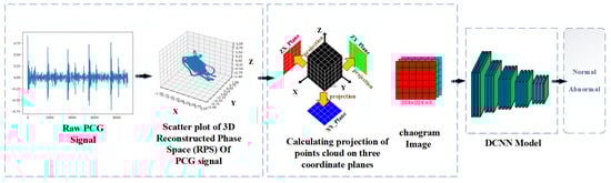 Flow diagram of the proposed approach for PCG signal classification: (1) building RPS from the original PCG signal; (2) projections of data represented in RPS are calculated on the XY, XZ, and YZ coordinate planes to form the red, green, and blue channels of the corresponding RGB image; (3) the chaogram is formed as a compatible input for a deep convolutional neural network; (4) a DCNN model pretrained on the large ImageNet Dataset is used for learning the extraction and classification of the chaogram’s high-level features; (5) the PCG signals are classified as normal or abnormal signals using the trained DCNN model.