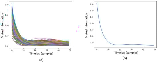 where  stands for the probability density function of x, and  denotes the joint probability density function of x and y variables. Here, for all the samples in the PhysioNet dataset, the mutual information of the PCG signals and their corresponding delayed versions were calculated for the time lags of 0 (zero) to 50, as shown in Figure 3. As seen from the graphs in Figure 3, the first minimum of mutual information offered by different samples is a digit between 10 and 20. According to Figure 3, the first minimum of mutual information in the averaged curve is placed on the time lag of 18. Therefore, it was considered that . Although, based on the experiments performed in this study, the optimum dimensionality for embedding dimension for PCG signals is 4, we considered that  in order to build the used chaogram images.