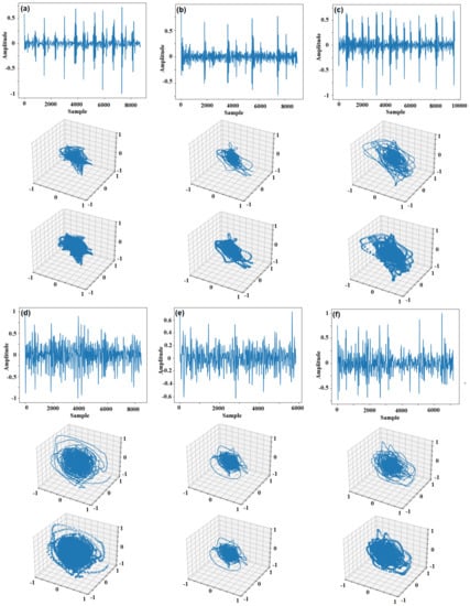 The  of a PCG signal is considered to model the nonlinear dynamics of the heart as the system that generates the PCG signal. Observations also confirm that the patterns formed in the  of PCG are strongly correlated with the heart’s functioning condition. Figure 4 shows six PCG signals (three normal and three abnormal) and their representation in RPS (with  and ). In the original , a curve goes from one point to another according to a sequence (rows 2 and 5 of Figure 4). By eliminating the links between the points, the  would be converted into a set of points in a 3D space (rows 3 and 6 of Figure 4). The shapes of these data points form cloud-shape patterns giving fundamental information about the corresponding system [].