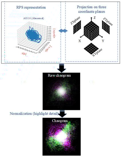 To build a chaogram image, reconstructed phase space (RPS) is a beneficial tool for analysing a system’s nonlinear and chaotic behaviour []. A phase space comprises the collection of all possible states of a system. However, determining all the possible states of real systems is usually impossible. Instead, the output signal of the system under study can be used to reconstruct its phase space. This signal inherits the main characteristics of its system. Here, the PCG signal is considered to be the output of the heart, i.e., the main system; then, the RPS can be built by defining the vectors: