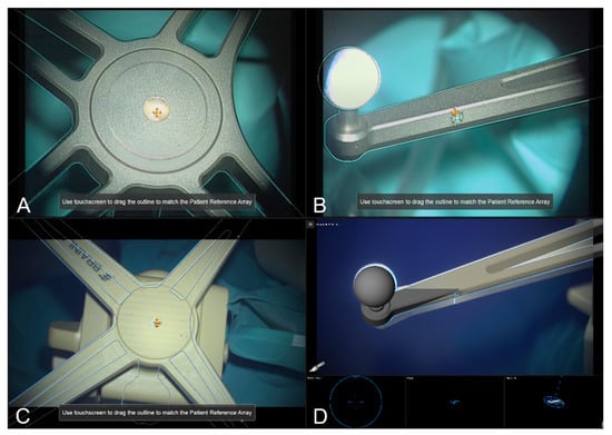 In the microscope application, thus far only the stainless-steel cranial reference array is available as the corresponding AR visualization perfectly matches the real reference array if matched correctly. In the case of using intraoperative CT imaging as done in this study, there is a discrepancy seen in the 3D AR visualization as the specific layout is not yet provided by the software, but the integrated markers (e.g., divot), and the reflecting spherical markers, can be used to verify the matching of AR and reality, see Figure 2.