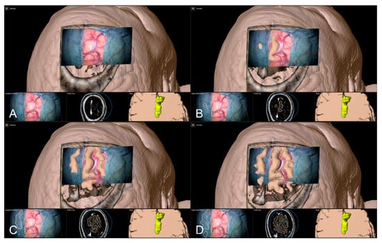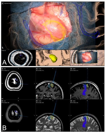 - Sun, G.C.; Wang, F.; Chen, X.L.; Yu, X.G.; Ma, X.D.; Zhou, D.B.; Zhu, R.Y.; Xu, B.N. Impact of Virtual and Augmented Reality Based on Intraoperative Magnetic Resonance Imaging and Functional Neuronavigation in Glioma Surgery Involving Eloquent Areas. World Neurosurg. 2016, 96, 375–382. [Google Scholar] [CrossRef]