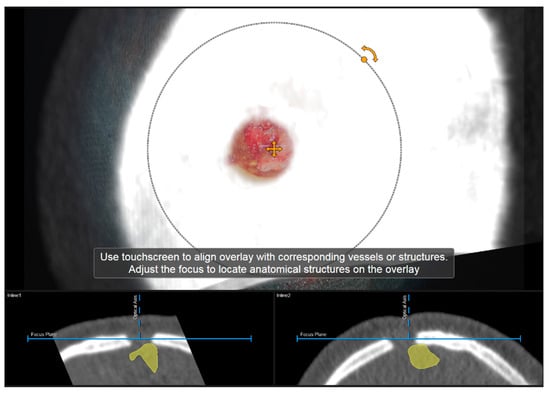 Despite high navigation accuracy achieved by applying an automatic patient registration approach utilizing low-dose iCT registration scan overcoming navigational errors of fiducial-based or surface-based approaches [,,,,,], during surgery navigation inaccuracies might occur. However, various aspects might lead to decreased accuracy. In addition to the movements of the patient itself, due to possible too-low sedation or shifting of the patient’s head in the head clamp, the handling of the patient reference array during draping and surgery might cause inaccuracies [,,]. In addition to those mechanical aspects, obvious changes in anatomy due to brain shift and/or ongoing tumor resection lead to discrepancies between the real-world anatomy and image data that was acquired before surgery. As brain shift itself is typically addressed using intraoperative imaging techniques, such as ultrasound, computed tomography, or magnetic resonance imaging [,,], estimating the amount of brain shift or updating intraoperative navigation, the microscope application (Brainlab Elements, Brainlab, Munich, Germany) allows compensating for inaccuracies by adjusting the image set and in situ patient anatomy within the recent microscope’s focal plane. The navigation update feature offers two different possibilities for alignment. On the one hand, a maximum intensity projection (MIP) of the image set at the level of the current focus plane can be used. On the other hand, the 3D outlines of the pre-segmented objects can be displayed according to their recent registration. If a discrepancy is seen the visualized MIP or object representation can be transformed by shifting and rotating the overlay within the focus plane to match the patient’s anatomy. After verification of the altered correlation, the updated registration will be applied to overcome the discrepancies at this level.