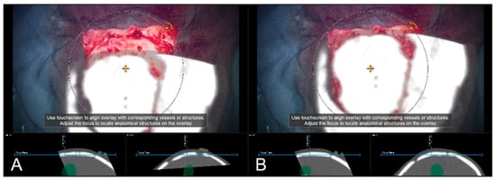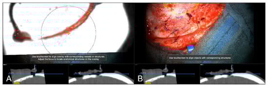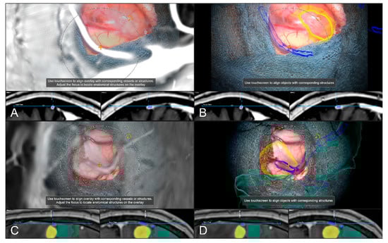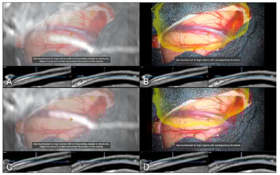 Augmented reality encompasses merging data from real-world environments and virtual information and vice versa. Within the surgical application, AR superimposes virtual information such as image data and additional information into the surgeon’s view of the patient. AR thereby complements and integrates the idea of standard surgical navigation relying on virtual reality only, providing a real-time updated 3D virtual model including anatomically relevant information overlaid on the surgical field []. First suggested by Kelly et al. and Roberts et al. in the 1980s, superimposing tumor outlines derived from preoperative CT data into the view of the surgical microscope, the commercialization of HUD microscopes in the 1990s introduced microscope-based AR to the broad neurosurgical community and has found its way into clinical practice [,,,,]. In addition to visualizing multimodal fused image sets and outlined objects of interest, such as tumor or risk structures, on a navigation screen close to the surgical field, those objects can be visualized using the integrated AR display by superimposing the 3D objects in the operating microscope by the integrated HUD, supporting the surgeon’s mental transfer of relevant information between image space and surgical field and thereby reducing the demand for attention shifts and increasing surgeon comfort [,,,]. Thus far, AR-support in microscope-based neuronavigation was mainly used as intraoperative guidance tool. However, the concept of using AR for accuracy checks has been brought up in different studies investigating phantom data or small case series, most often focusing on bony structures, areas with limited brain shift or in spine surgery [,,]. Using AR for evaluation of registration accuracy and improving registration accuracy throughout cranial surgery was recently suggested [,]. As proposed by [], the cortical surface representation or prominent vascular structures, clearly identifiable intraoperatively, might be suitable to identify and compensate for inaccuracies prior to resection. The availability of the tool has been reported in small cohorts in case of skull base lesions [] or aneurysm surgery [].