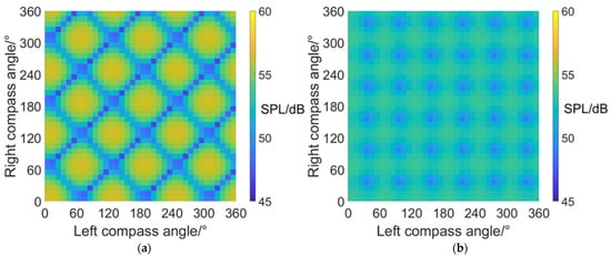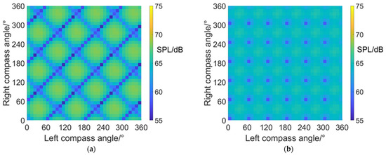 At scissors angle difference = 0°, noise SPL reaches relatively low values when left and right compass angles satisfy the relationship of: