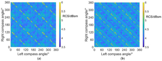 - As for the average RCS of coaxial tilt-rotor aircraft, the variations in the scissors angle difference bring complex influences to the distribution of average RCS values on the carpet diagrams. The distribution of average RCS values appears to have clear lines of low values at an azimuth angle = 0°, almost the same value at an azimuth angle = 90°, and a periodic but rather vague distribution at an azimuth angle = 180°. Moreover, the average RCS in helicopter mode is lower than that in fixed-wing mode at an azimuth angle = 90° but higher at an azimuth angle = 0° and 180°.