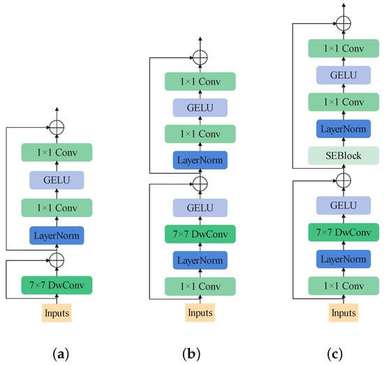 Inspired by MetaFormer and ConvNeXt, the first designed block is shown in Figure 6a. It follows MetaFormer to be composed of two parts: the token-mixer and the channel-mixer parts. DwConv is used to play the role of token-mixer. Concerning the channel-mixer, it follows ConvNeXt, implementing only one layer norm and one GELU as the activation function.
