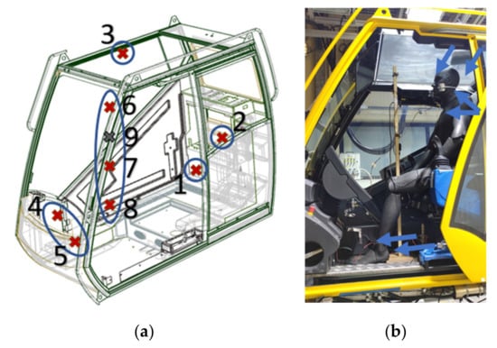 View of the crane cabin: (a) schematic representation of the sensors positions; (b) view of the vent positions.