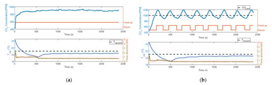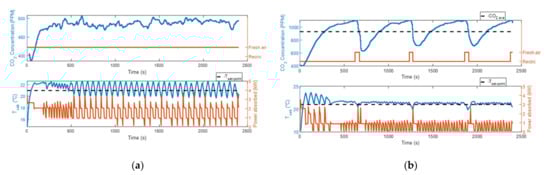 With the ventilation distribution set in cooling mode, we measured higher CO2 concentration levels with respect to the heating mode cases, even if the fan speed was the same (50% of the maximum value), as shown in Figure 4 and Figure 5. The reason was probably an accumulation of CO2 in the breathing zone, where the CO2 sensor was placed (sensor 9 in Figure 1a), due to the different internal movement of air. When the air recirculation control strategy was used, this caused a faster increase in the measured CO2 levels when the air recirculation mode was on and a slower decrease when the fresh air mode was taking place. This phenomenon triggered a more frequent on/off of the recirculation mode, with respect to the heating condition, as shown in Figure 4b and Figure 5b. When the air recirculation control strategy was on, the HVAC system spent about half the time of the experiment in the fresh air mode. This implied that the energy saving could not be as great as in the heating mode.