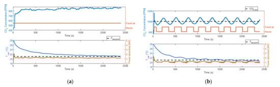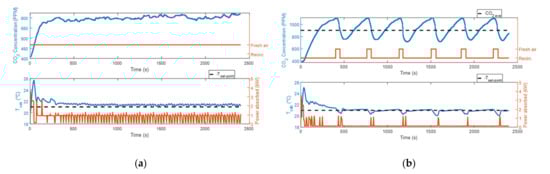 where is the initial value of the CO2 concentration in the cabin. In this particular condition, we obtain a linear equation with only one unknown, which is the cabin volume. Therefore, from Equation (6), considering two time instants, and , it is possible to find :