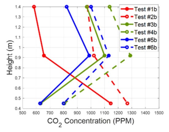 Test #1b and test #2b were executed in heating mode, and all the air was blown by the fan through the vents placed under the seat of the passenger. In contrast, in the ventilation and cooling modes the same air flow was also blown through the vents at the left of the manikin. In Figure 6 are represented the values of the CO2 concentration measured in the breathing zone against the height of the installation of the sensors with respect to the floor level. For the experiments where the HVAC system operated in the fresh air mode, we plotted the value of the CO2 concentration measured when we reached the steady-state condition for Equation (5). For the tests where the air recirculation control strategy was activated, the evolution in time of the CO2 concentration was always in a dynamic condition. Therefore, we plotted the time-averaged values measured by sensors 6, 7, and 8. The results in Figure 6 show different vertical stratifications of the CO2 levels in the breathing zone. In the heating mode, the CO2 concentration increased going from the roof level to the floor level, while in the ventilation and cooling modes the maximum values of the CO2 concentration were measured near the manikin’s shoulder level. It seems that in the last case, the air was more stationary in the breathing zone, causing an accumulation of CO2 in that area. Figure 6 shows that the CO2 stratification profile was similar in the ventilation and in the cooling modes because the air blown by the fan was distributed to the same vents. So, the internal aerodynamic of the cabin was almost alike; the difference was due to the convection effect. We can say that the diffusion of the CO2 in the cabin compartment is principally dependent on how we distribute the air flow between the various cabin vents.