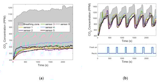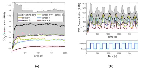 CO2 concentration measurements acquired from the 9 sensors that were installed in the cabin compartment: (a) test #5b; (b) test #6b (the colors of the curves are referred to in the legend in Figure 9a).