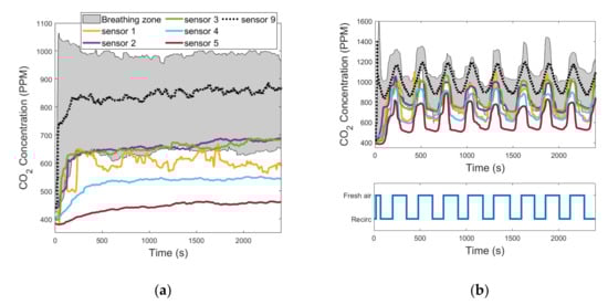 Pei et al. [] demonstrated, both through CFD (Computational Fluid Dynamics) simulations and experiments, that the CO2 concentration is not evenly distributed across a mechanically ventilated room. Furthermore, they proved that its diffusion changes depending on the ventilation settings. Considering that the required CO2 concentration levels should be maintained in the air that the occupant is inhaling, in this study we defined a parameter ([]) to assess the optimal location for the CO2 sensor inside the cabin.