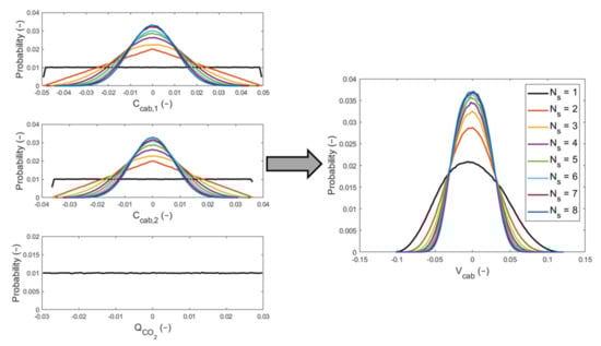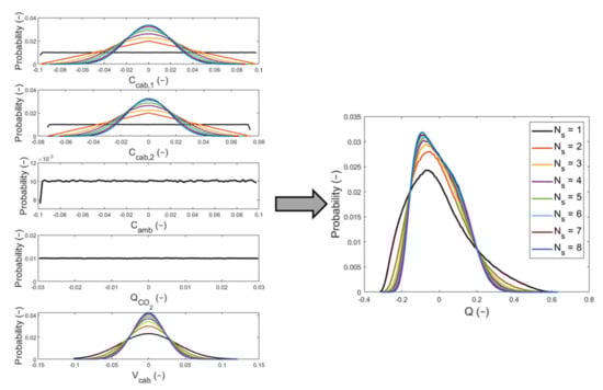 When two CO2 sensors are used, the probability distribution of the variables and becomes triangular, while with three or more CO2 sensors, it becomes Gaussian. The results from test #1c showed that the probability distribution of is Gaussian in all the tests performed, with a decreasing standard deviation as the number of CO2 sensors considered () increases. In Figure 10, the propagation of distributions for the input variables that appear in Equation (7) is plotted. On the left, there are the probability distributions for the input quantities: the in-cabin CO2 concentration levels at and and the source of CO2. On the right, there is the probability distribution for the indirect measurement of test #1c, which is the cabin volume. The curves related to each value of are plotted, and the results in the x-axis of Figure 10 have been normalized in this way:
