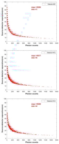 Following optimization of the simulation parameters of the GEANT4, the simulation was used to estimate the counts recorded by all the detectors for all the 931 known positions of the tracer particle. Figure 7 shows typical count versus distance obtained from the simulation for detectors no. 8, 10, 12, and 14 (along Bar#2). As shown in the figure, the recorded count by each detector increases as the source–detector separation distance decreases. The simulated photon counts recorded at the detector should represent the effective intensity of the tracer radiation. If no intervening medium is present, these recorded counts should follow an inverse-square relationship with distance. However, the distance count map is no longer an inverse-square relationship due to the difference in the attenuation of the photons caused by the intervening medium between the source and the detector. In addition, the trend of recorded counts exhibits a narrow decreases exponential curve, where data are not very scattered from each other, which favors the goodness of data obtained from either the RPT experiment or simulation. Additionally, it should be noted that the detector saturation effect is not detected for all the detectors owing to the prior preparation of the actual RPT setup with respect to detector positions. In the actual experiment, a case of detector saturation could occur when the rate of the photon reaching the crystal is higher than the photon counting rate of the detector.