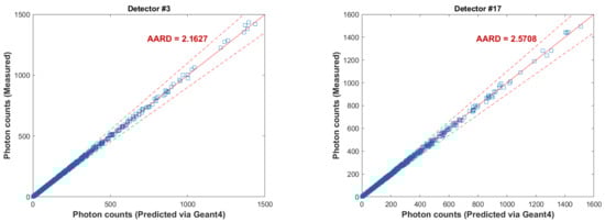 A parity plot of the calculated counts by the GEANT4 simulation and the measured counts is shown in Figure 10 for Detectors no. 3, 10, 17, and 24. The +5% and −5% limits are also shown in the figure. The simulated counts via the GEANT4 are in an excellent agreement with the measured counts via the experiment for all the detectors. The average absolute relative deviation (AARD) was calculated for all the detectors, where the maximum deviation was about 5% for Detector no. 28 and the minimum deviation was 1.5% for Detector no. 18. This demonstrates the validation of the GEANT4 model to estimate counts received by the detectors in the RPT calibration process.