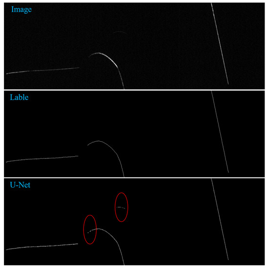 Models Ablation Study: A model ablation experiment was also conducted in this paper. Data tests were conducted on the visualization results of LuoNet_A, LuoNet_B, LuoNet_C, LuoNet_AB, LuoNet_BC, LuoNet_CA, and LuoNet (LuoNet_ABC). The test results are shown in Table 3, and it can be seen from the data indicators that the LuoNet designed by us has the best effect. The F1_score, Accuracy rate, Recall rate, and Miou ratio of LuoNet’s prediction results reached 71.4%, 62.3%, 83.5%, and 78.1%, respectively. The four indexes were all higher than the experimental results of LuoNet_A, LuoNet_B, LuoNet_C, LuoNet_AB, LuoNet_BC, and LuoNet_CA groups. It can be seen that LuoNet can better extract the stripe center of a subway wheelset laser curve, so we chose LuoNet as the subway wheelset laser curve centerline extraction algorithm.