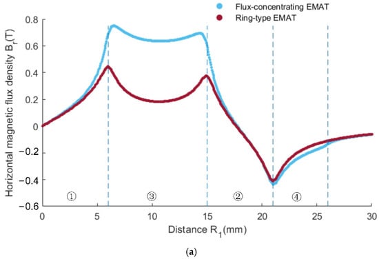 Magnetic flux profile of the ring-type EMAT and the flux-concentrating EMAT on specimen surface: (a) horizontal magnetic flux density, (b) perpendicular magnetic flux density.