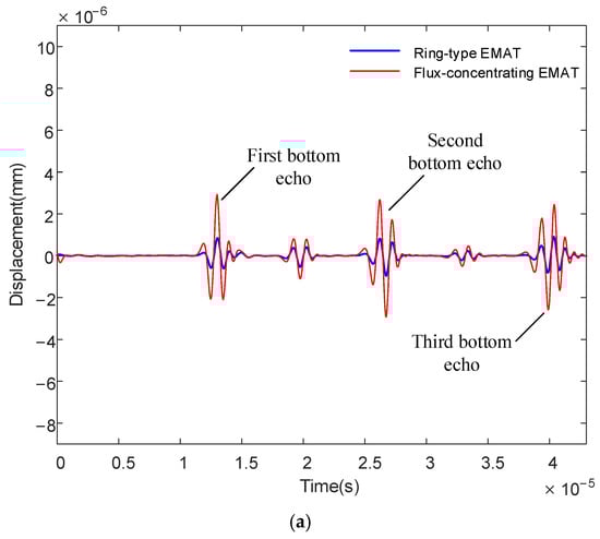 Figure 11 shows the simulated average displacement of ring-type EMAT and flux-concentrating EMAT on the specimen surface as it changes over time. From the figure, we can see the simulated first bottom echo at 13.1 µs, the simulated second bottom echo at 26.2 µs and the simulated third bottom echo at 39.3 µs. The time interval between the two adjacent echoes is about 13 µs. The specimen in the model is aluminum with a thickness of 40 mm, in which the longitudinal wave propagation speed is 6100 m/s, and the shear wave propagation speed is 3050 m/s. Therefore, the theoretical peak time of the first longitudinal-wave echo is 13.1 µs. The theoretical peak time of the first shear wave echo is 26.2 µs and the theoretical peak time of the third bottom echo is 39.3 µs. The peak position of the simulated waveform is completely consistent with the theory. In Figure 11a,b, the displacement amplitudes of the flux-concentrating EMAT are all significantly higher than those of the ring-type EMAT no matter which coil is used. The first and third bottom echoes are mainly longitudinal waves, while the second bottom echo contains shear and longitudinal waves. Therefore, the flux-concentrating EMAT can generate stronger longitudinal waves than the ring-type EMAT. In addition, it is found from the simulation that there is an echo signal between the two adjacent echoes, which is generated by the mode conversion of longitudinal waves reflected on the surface or underside of the specimen.