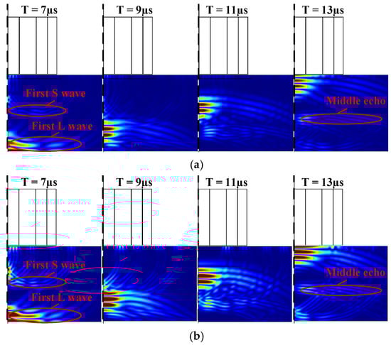 To better show the mode conversion mechanism, the snapshots of the displacement with the same color scale are shown in Figure 12. Figure 12a–d refer to the flux-concentrating EMAT and ring-type EMAT working in dual and longitudinal mode, respectively. It is known that the velocity of a longitudinal wave is faster than that of a shear wave and the wavelength of the longitudinal wave is longer. Thus, according to the relative position and wavelength, all of the important waves related to Figure 11 in the snapshots are annotated. The middle echo, which appears after the first longitudinal wave reaches the bottom at 7 µs, is the shear wave according to the snapshots and propagating time.