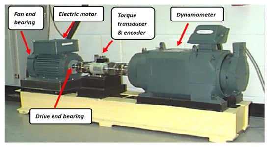 The Case Western Reserve University bearing database was employed in this study because a large number of recent studies have been based on this data set and have achieved good results. The experimental equipment is shown in Figure 1. All bearings tested during the experiment were SKF bearings, which can be divided into three classifications: ordinary bearings, drive end (DE) bearings, and fan end (FE) bearings [].