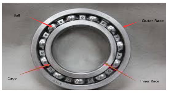 The accelerometer installed on the drive end of the induction motor was used for data collection. The sampling frequency was 12 KHZ, and each vibration signal was 10 s. The collected data included four bearing states: (1) normal state, (2) inner ring failure, (3) rolling element failure, and (4) outer ring failure. Figure 2 provides a physical drawing of the bearing. The sampling was completed at different speeds to capture each of these states: 1750 rpm, 1772 rpm, and 1797 rpm. Empirical mode decomposition was used to introduce a single point of failure. The fault point size was 0.007, 0.014, 0.021, and 0.028 inches. The experiment was also repeated under different loads, including 0, 1, 2, and 3 horsepower (hp) [].