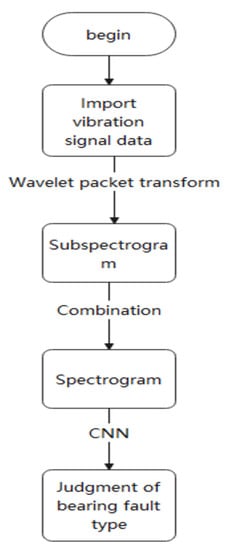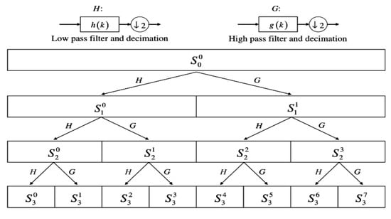 Machine-learning algorithms based on vibration signal processing are a common method used in bearing fault diagnosis []. Feature extraction of bearing signals is key for fault diagnosis, as the excellent features of bearing vibration signals aid in the accurate diagnosis of bearing faults. When a fault occurs, the time domain and the frequency domain of the output signal are different. WPT analysis can accurately find this fault information and location. Indeed, since WPT appeared in the early 1980s, its popularity has grown; WPT has many advantages over Fourier transform []. WPT is an important mathematic tool for analyzing nonlinear and non-stationary signals. It can decompose the signal into multiple sub-signals with different frequency ranges. Further, it can decompose the detailed information of the high-frequency area signal. Therefore, feature extraction of bearing vibration signals based on WPT is one of the most commonly used methods. The mathematical description of the WPT algorithm is as follows: