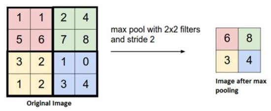 In simple terms, pooling is a non-linear down-sampling. The pooling layer completes two tasks. First, it reduces the input feature map to reduce the complexity of the model and optimize its calculation. Second, it compresses the features, extracts the main features, and reduces the phenomenon of over-fitting []. The process of pooling is roughly shown in Figure 10.