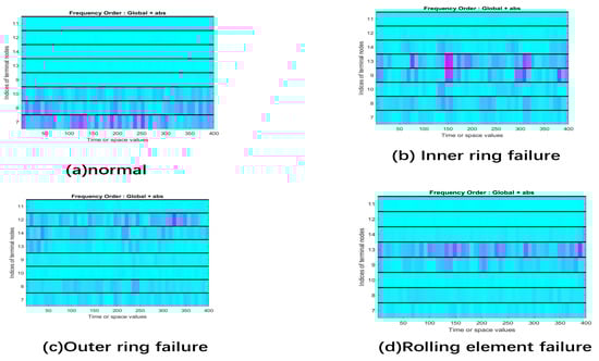 The state of bearings is classified as normal, inner-ring failure, outer-ring failure, and rolling element failure. Figure 11 shows the frequency spectrum of these four bearing states.