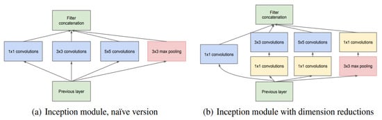 - Szegedy, C.; Liu, W.; Jia, Y.; Sermanet, P.; Reed, S.; Anguelov, D.; Erhan, D.; Vanhoucke, V.; Rabinovich, A. Going deeper with convolutions. In Proceedings of the IEEE Conference on Computer Vision and Pattern Recognition, Boston, MA, USA, 8–10 June 2015; pp. 1–9. [Google Scholar]