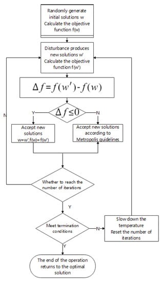 The core concept of SA can be roughly described as follows. As the initial annealing temperature drops, the optimal solution is constantly searched for within the feasible solution. Unlike the hill-climbing algorithm, the SA algorithm has a certain probability of accepting a solution that is worse than the original solution so that it can avoid getting trapped by local optimal solutions. The probability of accepting the poor solution continues to decrease until the SA finally approaches the global optimal solution. This process is just like that of metal annealing []. The general process is shown in Figure 13.