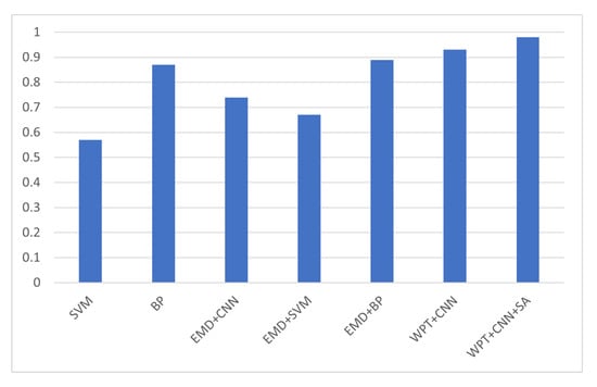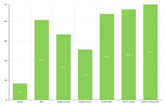 This study also compared the proposed bearing fault diagnosis method with some traditional algorithms [,] including support vector machine, BP neural network, and WPT—convolutional neural network. Finally, the effectiveness of the proposed diagnosis method was verified through the comparison.