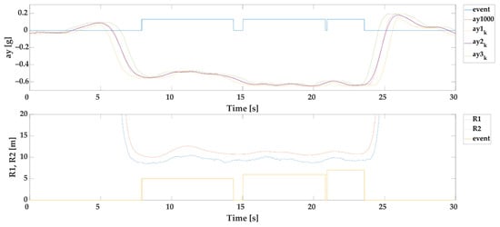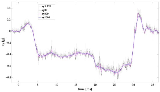 Effect of evaluation time on the lateral acceleration obtained from IMU during a vehicle’s cornering (-raw data, , , —evaluation times 80, 300, and 1000 ms).