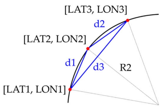 GNSS/INS position data are required for calculation to determine turning radius . GPS coordinates of latitude () and longitude () are necessary for calculation. Formula of curve radius computed based on three points (for circumscribed circle of triangle see Figure 2) was used to determine as follows: