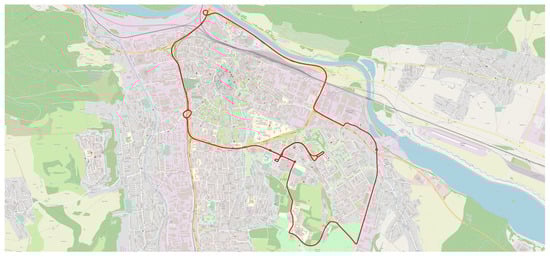 Two test routes were used in city of Žilina. Test route 1 (TR1; Figure 7) is a long route around the city of Žilina with the length around 17 km, meanwhile test route 2 (TR2) is a test route of three roundabouts on the street of Vysokoškolákov in Žilina with the length around 4.5 km. Each vehicle passed TR1 four times (except V3 with 6 passes) and certain vehicles passed also TR2 (one measurement is 4 passes; Figure 8). There are 42 test routes TR1 passed by 10 vehicles and 7 test routes TR2 passed by 7 vehicles. Total distance travelled by vehicles was 746 km. All tests were done during 6 nights of October and November of 2021 between 22:00 and 4:00 with the less possible traffic in city to pass the curves as fluently as possible.