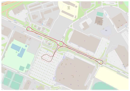 Mischinger et al. [] developed a method for analysis and assessment trajectory planning methods and controller types for usage in automated vehicles. These controllers occurred to be characterized by differences in lateral deviation and in the smoothness of lateral accelerations (as the authors mentioned, lateral accelerations have to be limited due to critical environmental conditions, e.g., a slippery road surface). The authors presented results obtained with the simulation method (which exchanged data between a path planner, a controller, and a vehicle model) and actual field test drives in the same roundabout as for simulations.