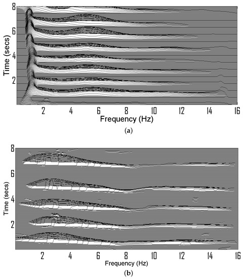 Let us consider a TF signature of EEG seizure signal with spiky characteristics as shown in Figure 3a. The TF signature of spikes is extracted by as shown in Figure 3b. The time-domain marginals obtained from and are illustrated in Figure 3c. Note that time-marginal obtained from contains energy from both spike and tone components whereas the time-marginal obtained from only has energy from spikes.
