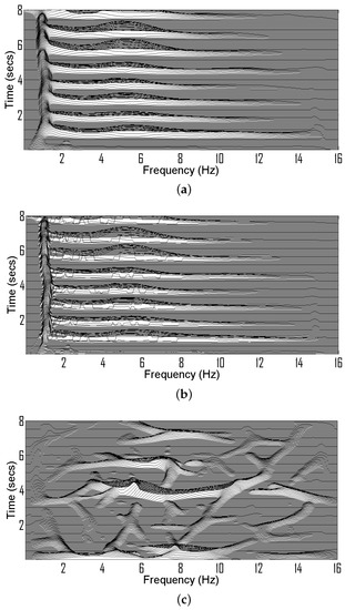 EEG seizure signals are modeled as either train of impulses or as the sum of harmonically related frequency modulated chirps, whereas background appears as noise. To enhance discriminatory characteristics of seizures, EEG signals are first pre-processed through differentiator filter [27] as: . This differentiation implementation can be implemented digitally as . Let us analyze two types of EEG seizure signals and EEG background signals in the joint TF domain using the ADTFD. Figure 2a illustrates a TF representation of EEG seizure signal with spiky characteristics, Figure 2b illustrates TF representation of seizure signal composed of frequency-modulated chirps, and Figure 2c illustrates TF representation of non-seizure signal.