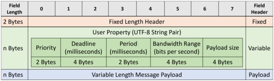 The message format used in RT-MQTT follows the MQTT V5.0 message structure, in which the User Properties field is placed in the Variable Header and conveys the relevant real-time attributes, as illustrated in Figure 2.