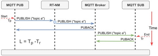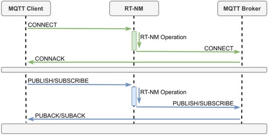 The real-time information can be modified at any time by MQTT clients, which can register or update real-time attributes of any given topic in the OF-DB. These attributes can be set initially, during the connection phase, using the CONNECT message, or added/updated later on, e.g., when a client publishes data via a PUBLISH message. In the same way, subscribers can specify real-time requirements when connecting or when subscribing to a topic using a SUBSCRIBE message. Figure 5 shows the sequence diagram for connecting, publishing, and subscribing. Note the RT-NM receives the messages, validates their attributes, and performs the corresponding network configuration, while the broker eventually sends an acknowledgment back to the client. A technical description of RT-MQTT services is publicly available (https://new-rt-mqtt-extension-api.readthedocs.io/en/latest/, accessed on 31 January 2022).