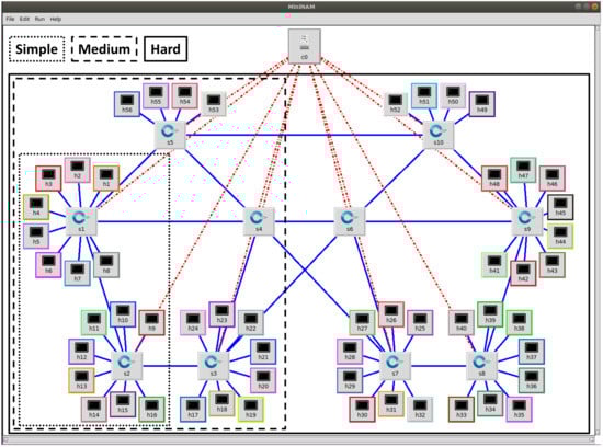 We used the Mininet virtual network emulator, version 2.3.0d6 http://mininet.org/, accessed on 31 January 2022, together with Eclipse Mosquitto [] (v2.0.10) and Eclipse Paho MQTT library to create MQTT clients and brokers. Mininet is executed on a laptop computer featuring a 4.9 GHz Intel Core i7 processor and 16 GB of RAM.