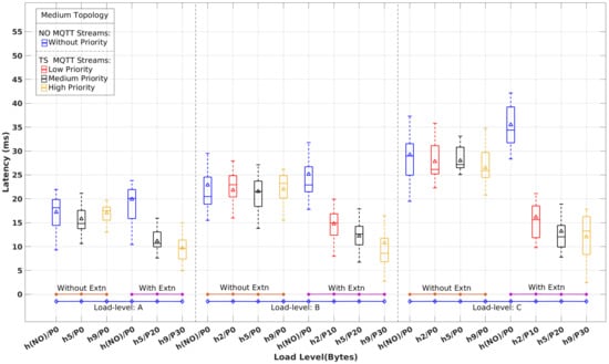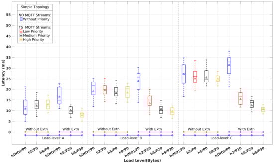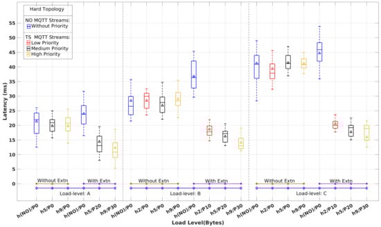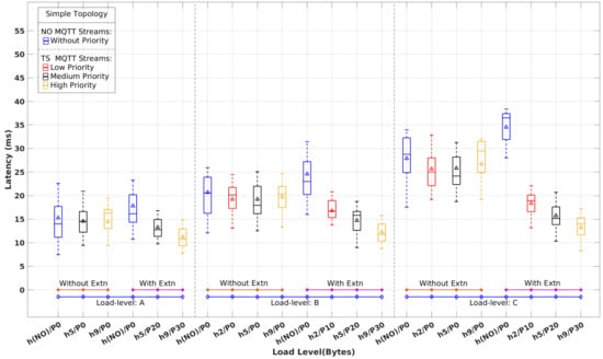 Figure 8, Figure 9 and Figure 10 show the latency distribution with box plots that were obtained for normal (NO) and time-sensitive (TS) MQTT flows, with and without the real-time extensions, for each topology and all load-levels. As there is no differentiation among the NO flows, their latency values are aggregated in a single column. Concerning the TS flows, for the sake of clarity, we show just the ones with the highest, median, and lowest priority, except for load level A, which has two TS publishers, only, both shown in the figures. The horizontal axis identifies publishers, labeled as for host with priority . and stand for the aggregation of NO MQTT flows.