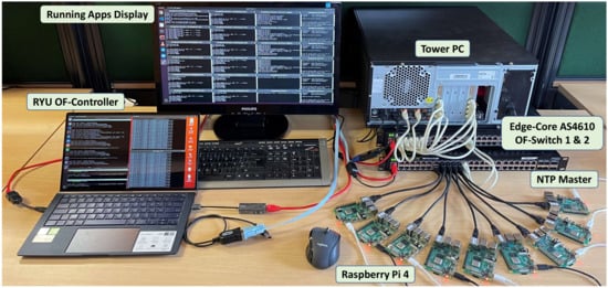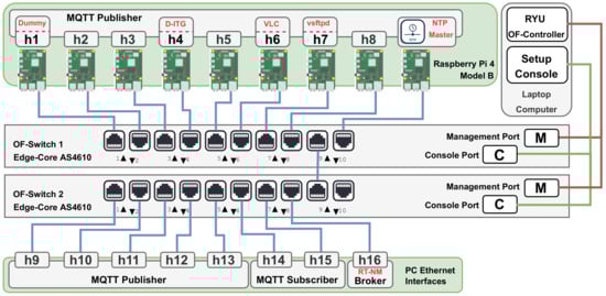 The hardware structure of the physical RT-MQTT set-up is shown in Figure 11. It comprises two Edge-Core AS4610-54P bare-metal switches that integrate Open vSwitch with OpenFlow support and one laptop computer equipped with a 4.9 GHz Intel Core(TM) I7 processor and 16 GB of RAM to run the SDN controller and a management console. Moreover, the MQTT Broker and eight MQTT clients are executed on one tower computer equipped with a 3.40 GHz Intel(R) Core(TM) i7-4770 processor, 8 GB of RAM and 10 individual Ethernet interfaces, 2 of which in the motherboard (Intel I210 Gigabit Network Connection) and 8 available via expansion cards (Intel Ethernet Server Adapter I350-T4). Finally, 8 Raspberry Pi 4 Model B are used to run additional MQTT clients. The software infrastructure is equivalent to the one used in emulation, i.e., the SDN controller is the RYU OF-Controller, Eclipse Mosquitto is used as the MQTT broker, and MQTT clients (Publishers and Subscribers) are based on the Eclipse Paho MQTT library.