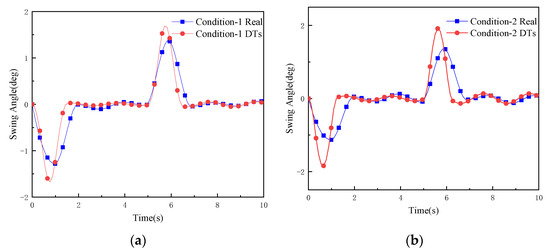 To verify the effectiveness and accuracy of the virtual test of the digital twin-based anti-swing control, the real swing angle data (Condition Real) of the physical RMGC measured by the gyroscope under three working conditions were extracted and compared with the swing angle data obtained by the digital twin RMGC virtual test (Condition DTs) using the ZV shaping method. The results are shown in Figure 14.