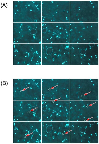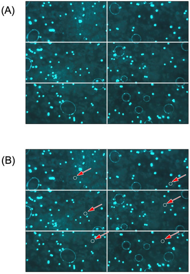 Figure 1A shows a fluorescent microscopic image of PS microplastics stained with Nile Red and URFP-100 particles, in which darker spots correspond to the stained PS microplastics, circled in yellow and identified by red arrows in Figure 1B, and brighter ones for URFP-100. The values of the fluorescent intensity for the microplastics were obtained as described in the Experimental Section. Briefly, an individual single particle for each divided area was selected, and the average and standard deviation were calculated for one particle each in the nine areas. The particles used for the calculation are identified with red arrows.