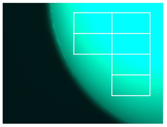 Fluorescent microscopic image of a single PP microplastic stained with Nile Red. The image was divided into six areas that were selected for analysis of fluorescent intensity.
