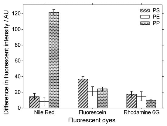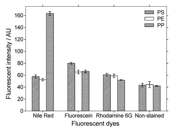 Although our previous paper discussed the detection of microplastics based on signal enhancement [], this paper discussed the detection of microplastics based on staining of microplastics due to adsorption of fluorescent dyes on microplastics. In this study, as shown in Figure 5 and Table 1B, of the three microplastics tested, Nile Red gave the highest fluorescent intensity with PP, whereas Fluorescein gave the highest fluorescent intensity with PS. These results indicate that Nile Red was selectively adsorbed on the surfaces of PP particles and that Fluorescein was selectively adsorbed on the surfaces of PS particles.